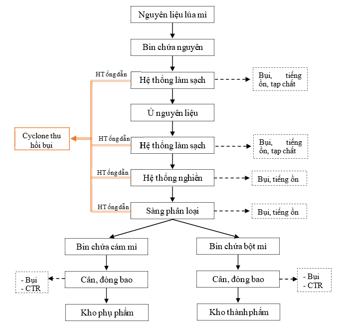 Nơi bốc dỡ nguyên liệu, kho chứa nguyên liệu và kho thành phẩm là các silo chứa: nơi đây phát sinh bụi không nhiều vì hạt lúa mì đã được bóc vỏ, chứa trong bao và được chuyển đến kho tồn trữ (silo). Dây chuyền sản xuất của nhà máy là dây chuyền khép kín từ khâu nhập nguyên liệu đến thành phẩm đóng gói, đồng thời tại các dây chuyền phát sinh bụi cũng được bố trí các đường đóng hút thu hồi bụi về hệ thống lọc bụi. Do đó dây chuyền sản xuất của cơ sở không phát sinh bụi nhiều, đảm bảo môi trường làm việc của công nhân và môi trường không khí xung quanh.